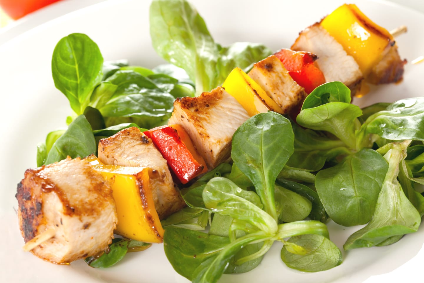 Das restliche Öl in einer Pfanne erhitzen und die Hähnchenspieße braten. Mit Salz und Pfeffer würzen. Zusammen mit dem Feldsalat anrichten. Mit den gehackten Walnüssen bestreut servieren. Guten Appetit!
