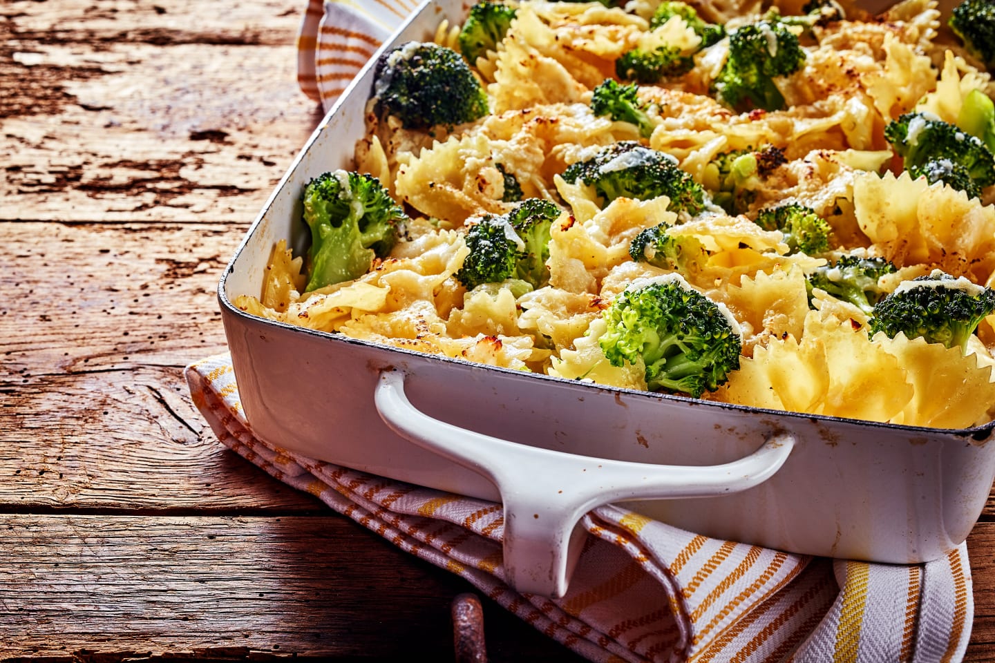 Die Spaghetti in kochendem Salzwasser nach Packungsanleitung garen. Eine Minute vor Ende der Garzeit den Brokkoli (frischer oder TK Ware) zugeben, anschließend abgießen und in eine Auflaufform geben.