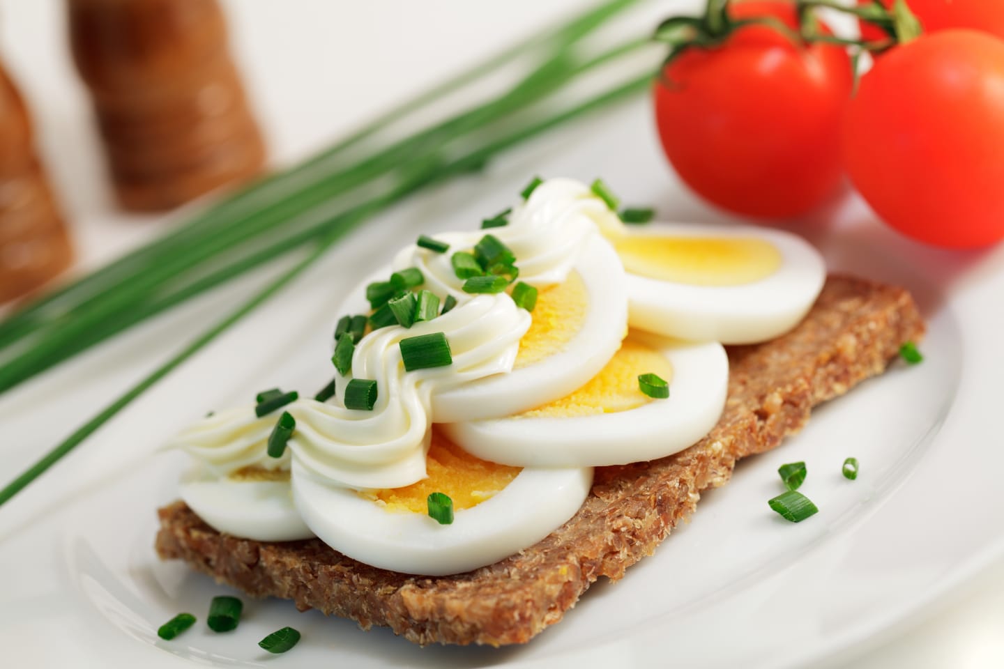 Brot mit Butter oder Pflanzenmargarine bestreichen. Hartgekochte Eier und Tomaten in Scheiben schneiden. Schnittlauch waschen und fein hacken. Die Eier auf dem Brot verteilen und darauf dann die Tomaten. Mit Salz und Pfeffer würzen und zum Schluss den Schnittlauch darauf streuen. Schmeckt auch gut mit Brunnenkresse oder mit frischen Zwiebeln.